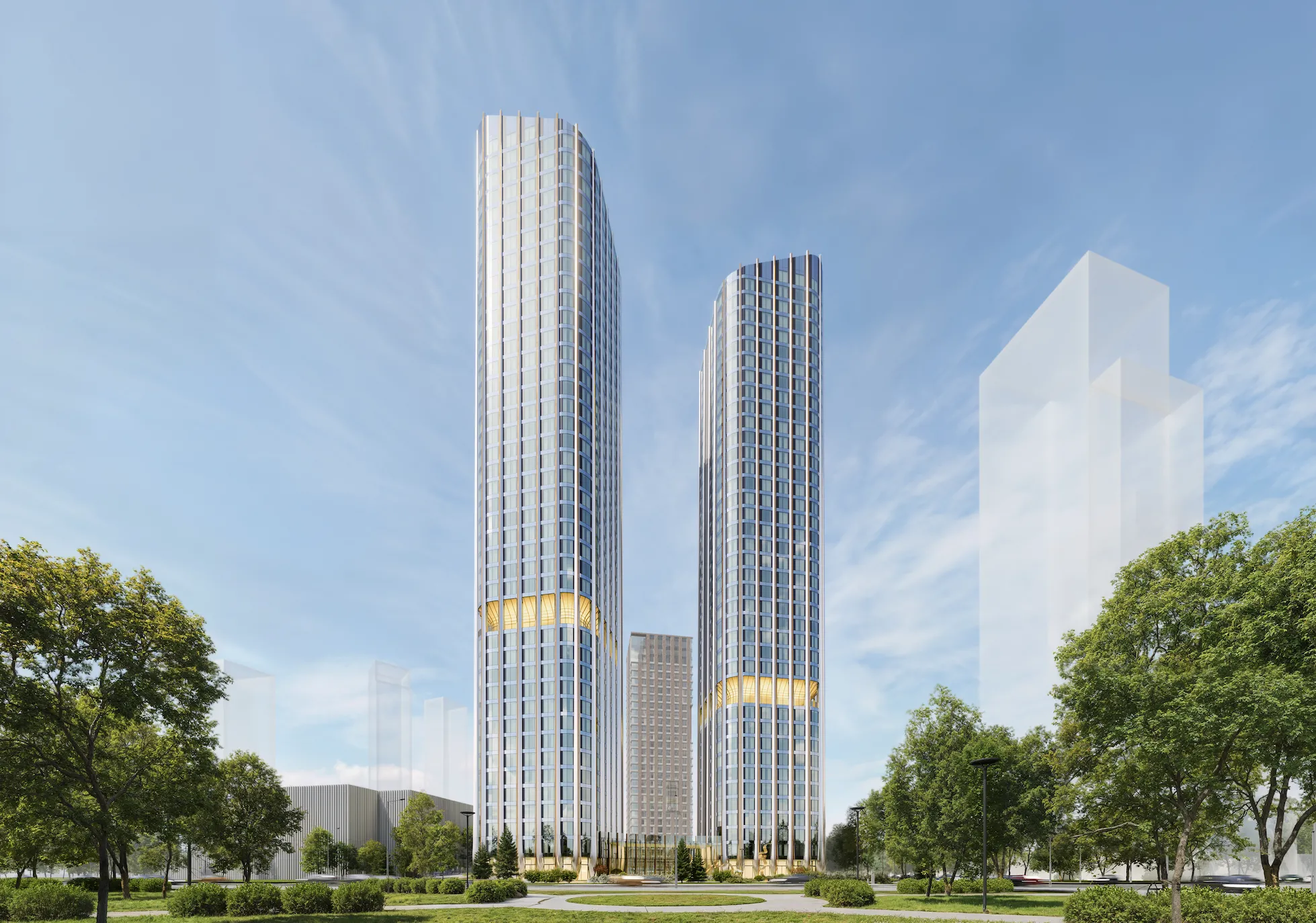 Акцентом всего ансамбля станут серебряные башни. Это два высотных корпуса в 42 и 38 этажей урбан-блока River 1. Они расположены в 500 метрах от реки, от воды их будет отделять только природный парк. Благодаря локации и расположению корпусов – тремя плоскостями обращены к реке – в них обеспечено максимальное количество видовых квартир. Над созданием концепции работало архитектурное бюро АПЕКС.