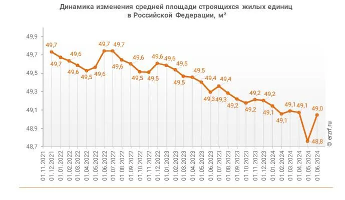 По сравнению с аналогичным месяцем 2022 года, показатель уменьшился на 0,7 м², по отношению к июню 2023 года он сократился на 0,3 м². При этом средняя площадь жилых единиц в домах, разрешение на строительство которых выдано в 2024 году, составляет 48,8 м² (в 2022 – 48,3 м², в 2023 – 48,5 м²).