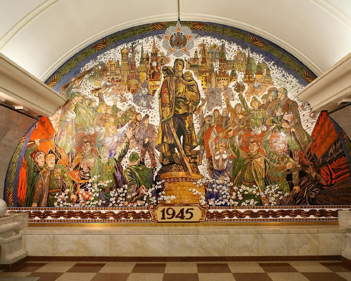 осмыслению «Парка Победы». Автором нового проекта стал Николай Шумаков. «Мы отказались от изначальной идеи создания двух принципиально разных по архитектуре залов. Два станционных зала, идентичных по архитектуре, построены по зеркальному принципу. Станции пилонного типа отделаны каррарским мрамором красного и белого цветов, во всю протяженность центрального зала идет сплошной карниз. В торцах залов установлены панно работы Зураба Церетели, одно из них посвящено Отечественной войне 1812 года, второе – Великой Отечественной войне, последнее было демонтировано в 2015 году при строительстве второго выхода из станции», – рассказывает архитектор.