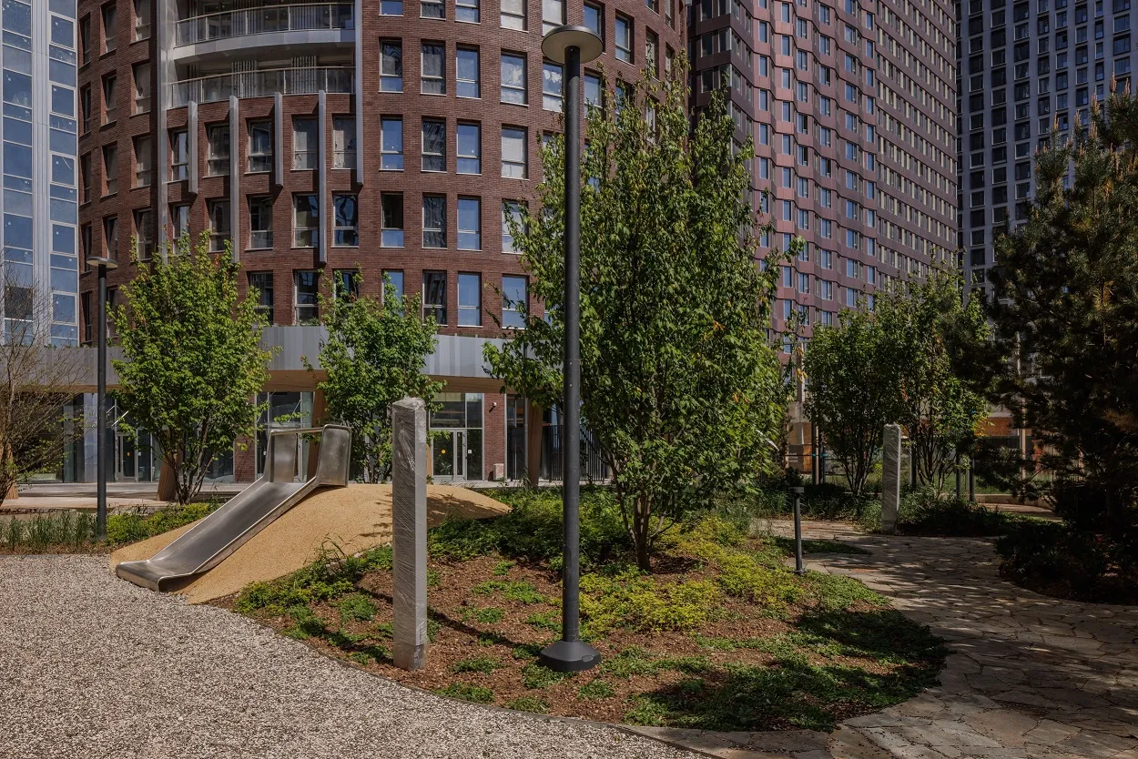Между корпусами для будущих жильцов организован двор с двухуровневым озеленением, в центре которого установлен водный объект с шестиметровым деревом – багрянником японским. Рядом размещены места для отдыха и навес. Общая площадь благоустройства составляет 2,8 тыс. кв. метров.