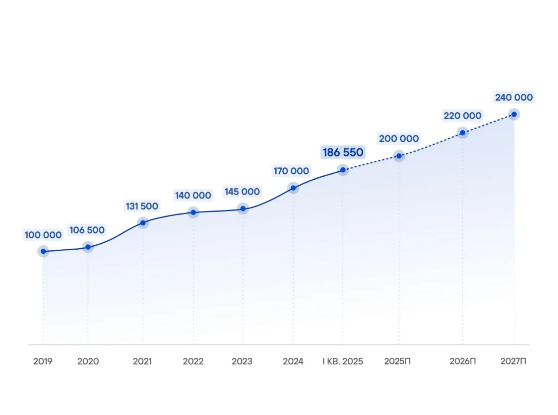 Стоимость строительства продолжает расти на фоне дефицита рабочей силы и повышенной инфляции производителей. По итогам 2024 года индекс цен производителей составил 12,1%. Стоимость строительства составила 170 000 руб./кв. м общей площади (с учетом НДС), продемонстрировав темп роста в 17% г/г. За I квартал 2025 года индикатор дополнительно увеличился на 10% и составил 186 550 руб./кв. м общей площади (с учетом НДС).