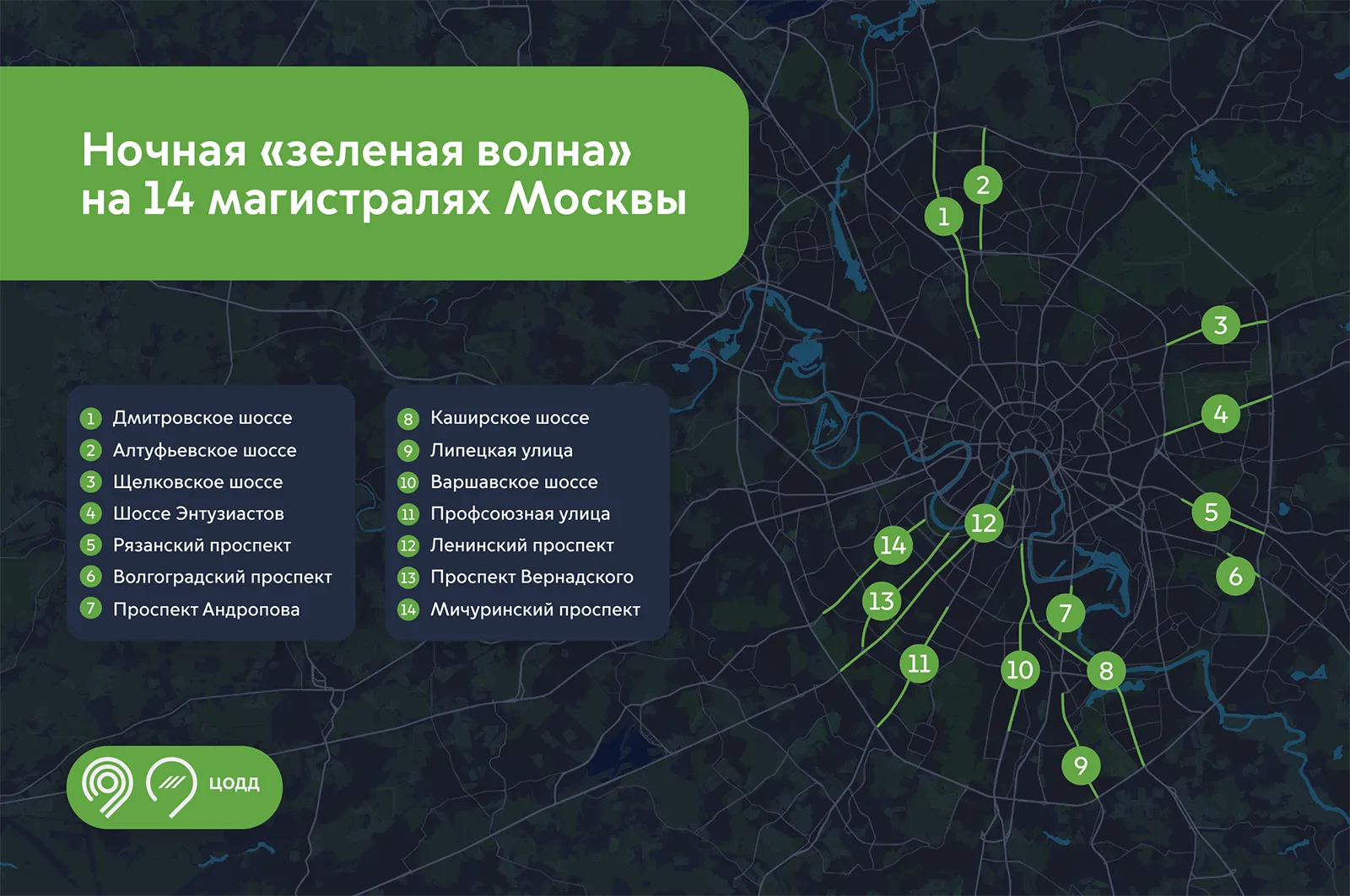 Ночная «зеленая волна» будет на Мичуринском, Ленинском, Волгоградском и Рязанском проспектах, Профсоюзной и Липецкой улицах, Варшавском, Каширском, Щелковском, Алтуфьевском и Дмитровском шоссе, на проспектах Вернадского и Андропова, а также на шоссе Энтузиастов. Например, если начать ехать по проспекту Вернадского на зеленый сигнал и двигаться со скоростью потока (примерно 55–60 километров в час), то при идеальных условиях участок можно преодолеть без остановок на красный свет.