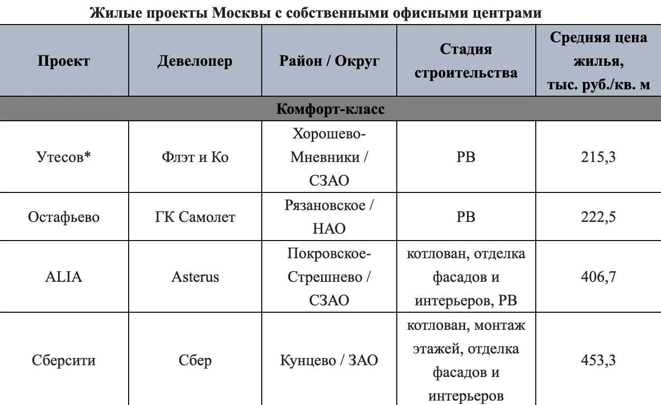 Единственный бизнес-центр в составе жилого проекта на первичном рынке Москвы, в котором все офисы имеют самый высокий класс А+, это МФК SLAVA от MR Group. «Проект SLAVA включает в себя полноценный деловой кластер из трех 20-этажных башен общей площадью 144 тысячи кв. м, – отмечает Мария Литинецкая, генеральный директор MR Group. – Благодаря реализации этого проекта рабочими местами будут обеспечены 12,7 тысяч человек, включая собственников апартаментов SLAVA. Он относится к числу комплексов, в которых в единое пространство объединены жилье, офисы, ритейл и рекреационные зоны. Такие проекты полностью соответствуют популярной концепции «15-минутного города», в соответствии с которой житель мегаполиса должен иметь возможность работать, отдыхать и развиваться рядом с домом. При этом различные функциональные зоны обязательно разграничены для оптимальной организации логистики и психологического комфорта-резидентов».