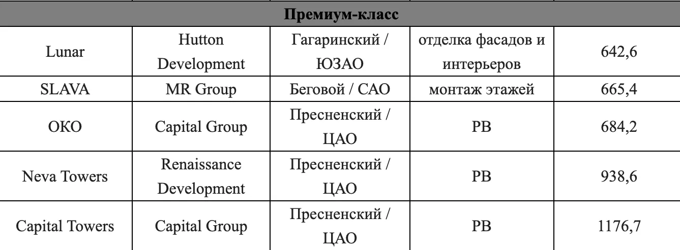 Девелоперы Москвы реализуют 14 проектов, в состав которых входят деловые центры в отдельно стоящих зданиях и стилобатах. Доля таких комплексов на первичном рынке составляет всего 3,1%[1]. Среди них четыре проекта относятся к комфорт-классу, пять – к бизнес-классу, пять – к премиум-классу, подсчитали аналитики «Метриум».
