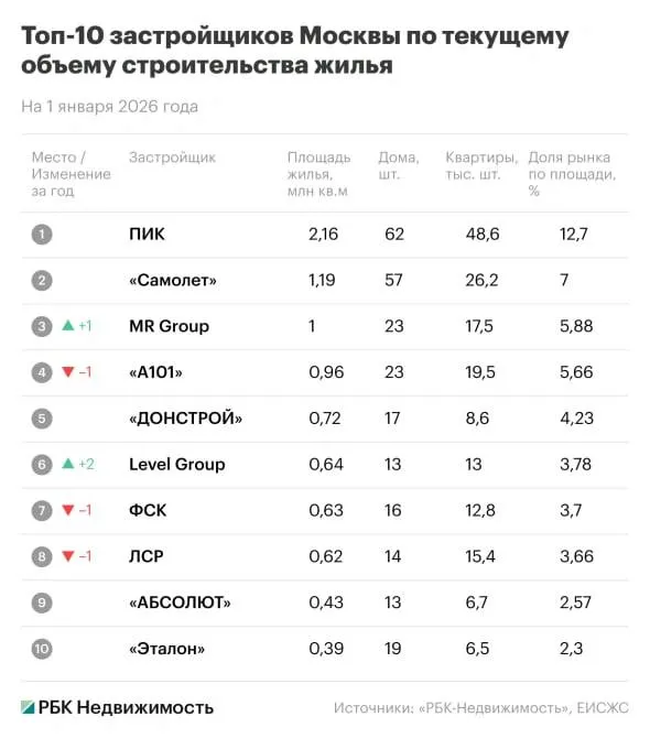 На начало января 2026 года «ПИК» строит в столице 62 жилых дома на 48,6 тыс. квартир общей площадью 2,16 млн кв. м. Это 12,7% от общего объема строящихся новостроек в Москве.