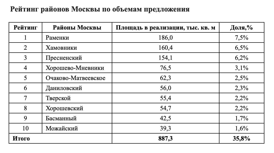 В топ-10 также попали Хорошево-Мневники (76,5 тыс. кв. м, 1 тыс. лотов), Очаково-Матвеевское (62,3 тыс. кв. м, 627 лотов), Даниловский (56 тыс. кв. м, 876 лотов), Тверской (55,4 тыс. кв. м, 449 лотов), Хорошевский (54,7 тыс. кв. м, 659 лотов), Басманный (43,5 тыс. кв. м, 425 лотов) и Можайский (39,3 тыс. кв. м, 573 лота).