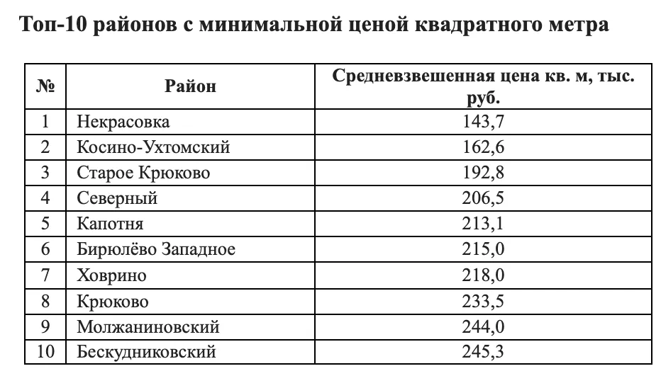 В топ-10 районов с наиболее низкой стоимостью квадратного метра также попали: – Северный (206,5 тыс. руб.),