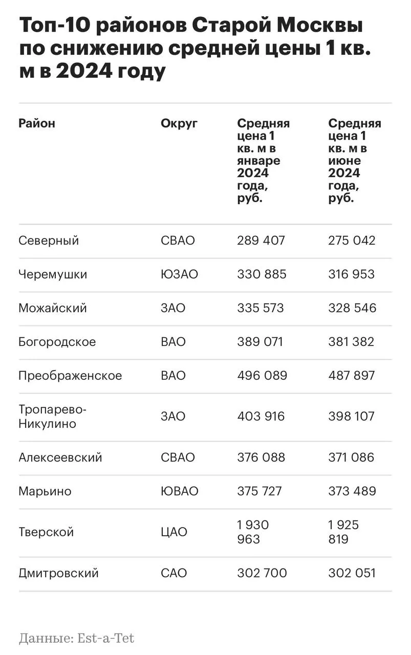 Северный район (расположен за МКАД по Дмитровскому шоссе, восточнее города Долгопрудный) занял первое место в рейтинге локаций Старой Москвы по темпам снижения цен на рынке новостроек с начала 2024 года. По итогам июня средняя цена 1 кв. м на рынке новостроек в этом районе составила 275 тыс. руб., что на 5% меньше, чем в начале января.