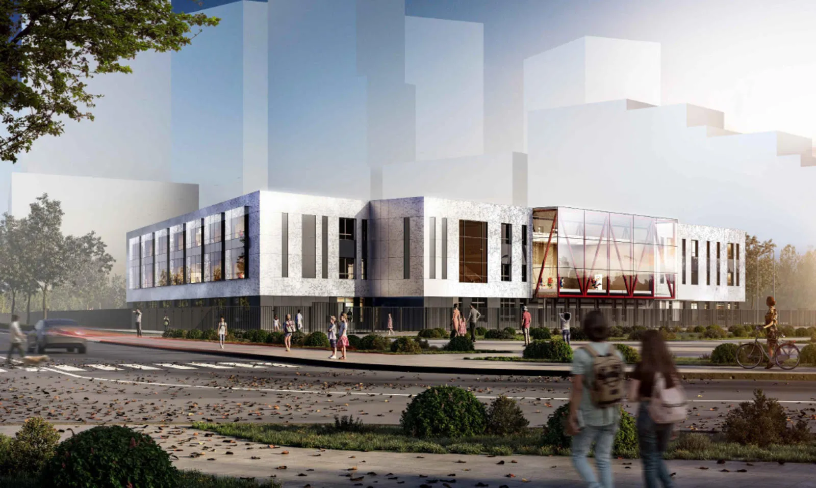 В школьной части запроектированы учебные классы, трансформируемый спортивный и многосветный актовый залы, информационный библиотечный центр, лабораторно-исследовательский комплекс, универсальные помещения, столовая, пищевой и медицинский блоки.