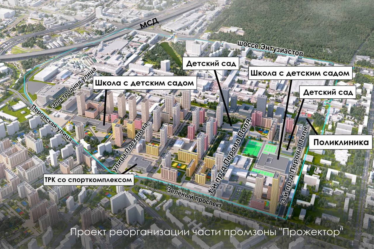На участке построят всю необходимую социальную инфраструктуру: школы, детские сады, поликлинику, торгово-развлекательный комплекс со спорткомплексом и другие объекты. Реорганизация территории «Прожектора» позволит создать порядка 10 тысяч рабочих мест.