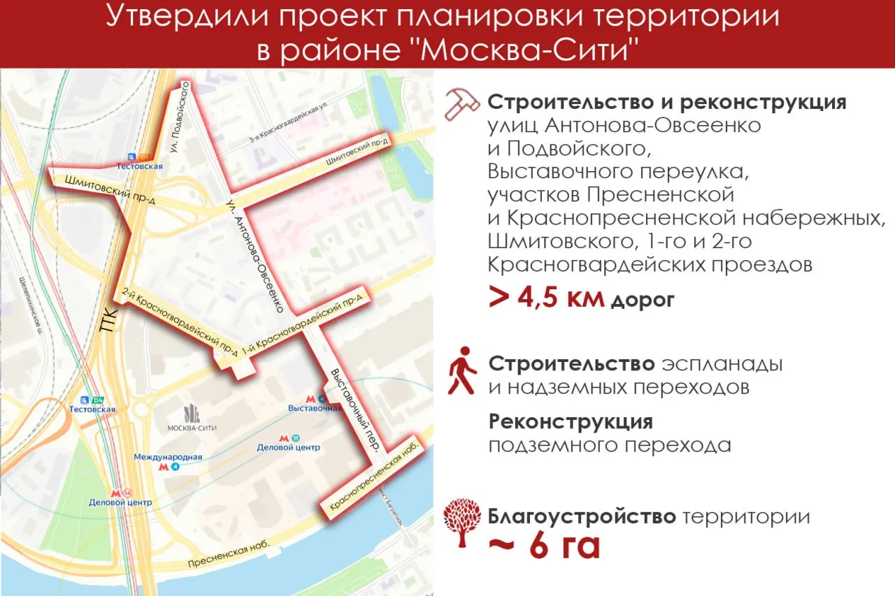 В рамках работ обновят улицы Антонова-Овсеенко и Подвойского, Выставочного переулка, участков Пресненской и Краснопресненской набережных, Шмитовского, 1-го и 2-го Красногвардейских проездов. Всего свыше 4,5 км дорог.