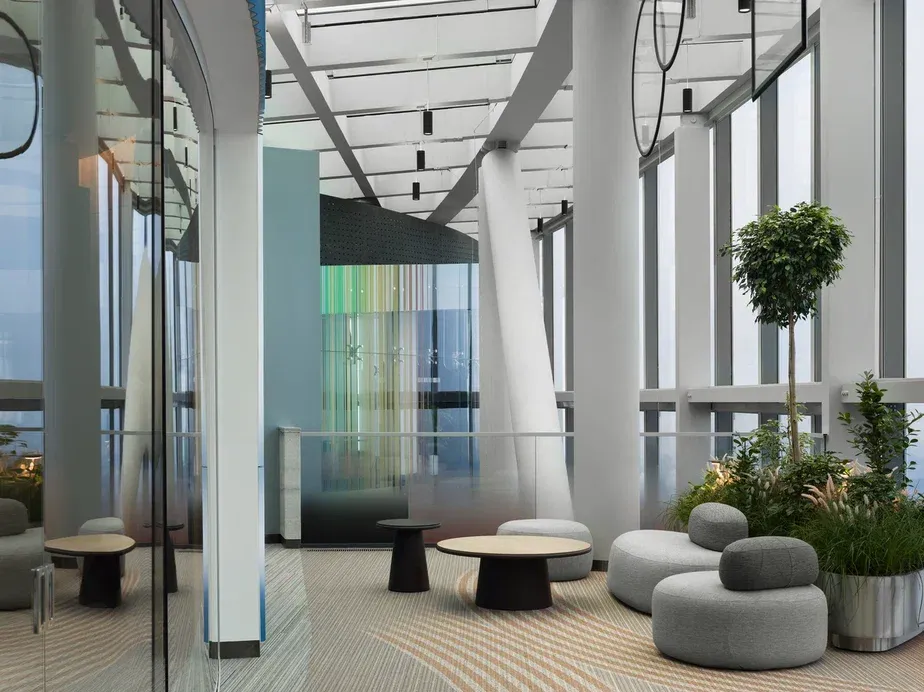 Сложность организации такого пространства обусловлена и необходимостью работать и поднимать строительные грузы на большую высоту, и желанием создать пространство высокого по своему качеству уровня под 14-метровым стеклянным куполом. Для перемещения по трем уровням созданы прозрачные лифты и мраморные лестницы. Причем практически все элементы интерьера (включая и лестницы) имеют обтекаемые формы, что соответствует форме самого небоскреба. Все поверхности стен обладают эффектом шумопоглащения.