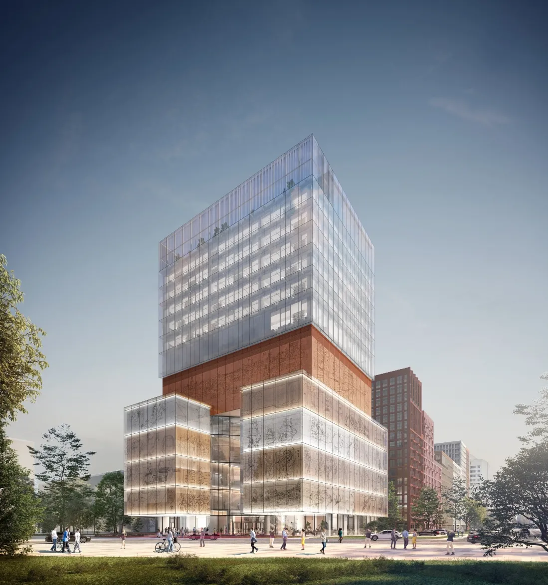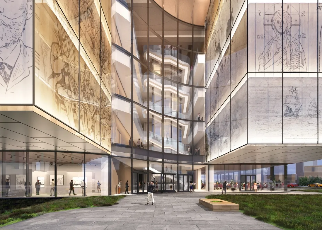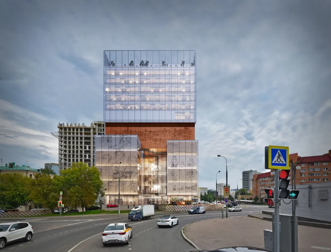 «В соответствии с функциональной программой объем здания получил выраженную по вертикали трехчастную структуру. Во-первых, доступная для публики музейная часть выделена с помощью более нарядных, художественно оформленных фасадов, тогда как офисный блок представляет собой светопрозрачный объем. На уровне первых пяти этажей, где экспозиционные залы соседствуют с габаритным пространством концертного зала, строение увеличивает свою площадь за счет симметричных консольных выносов», – прокомментировал Сергей Кузнецов.