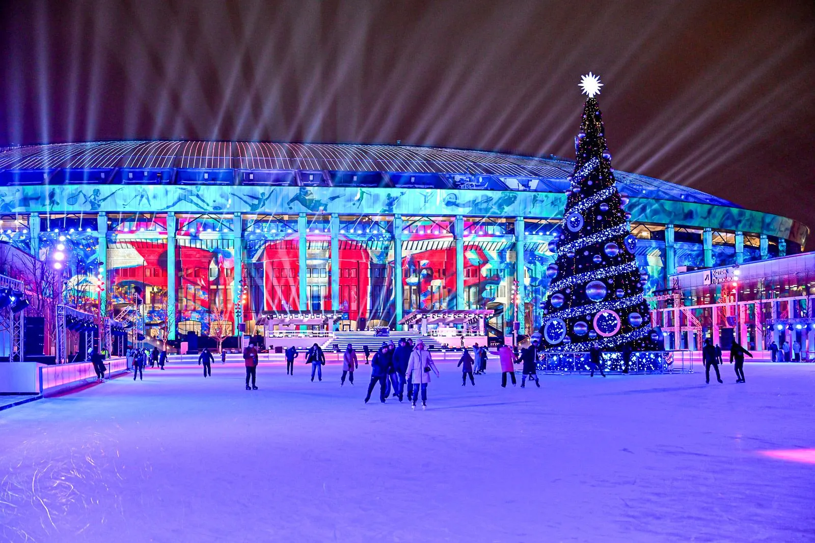 Во время вечерних сеансов фасад Большой спортивной арены превращается в мультимедийное полотно. Здесь проходят тематические шоу с использованием видеомэппинга и архитектурной подсветки. Центральным визуальным акцентом стала 16 метровая новогодняя медиаелка.