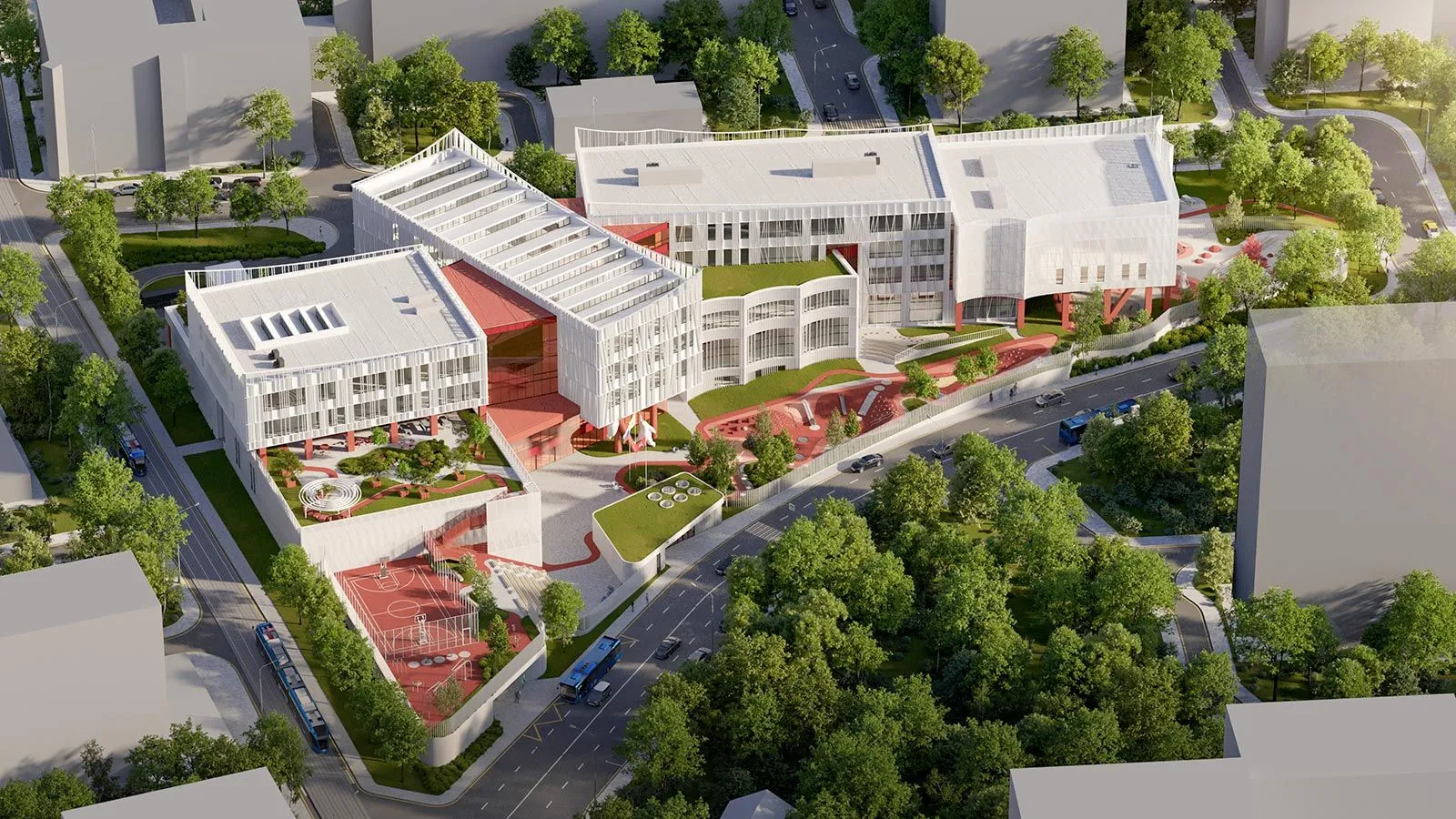 Здание спроектировали как «город в миниатюре». Перед архитекторами стояла задача совместить современные образовательные стандарты с исторической застройкой района. В результате появился проект пятиэтажной школы общей площадью около 20 тысяч квадратных метров. Внутри предусмотрены не только учебные классы, но и пространства для общения, работы и отдыха.