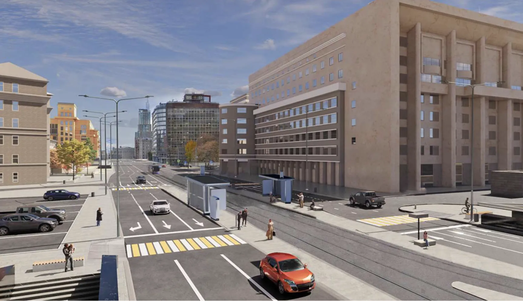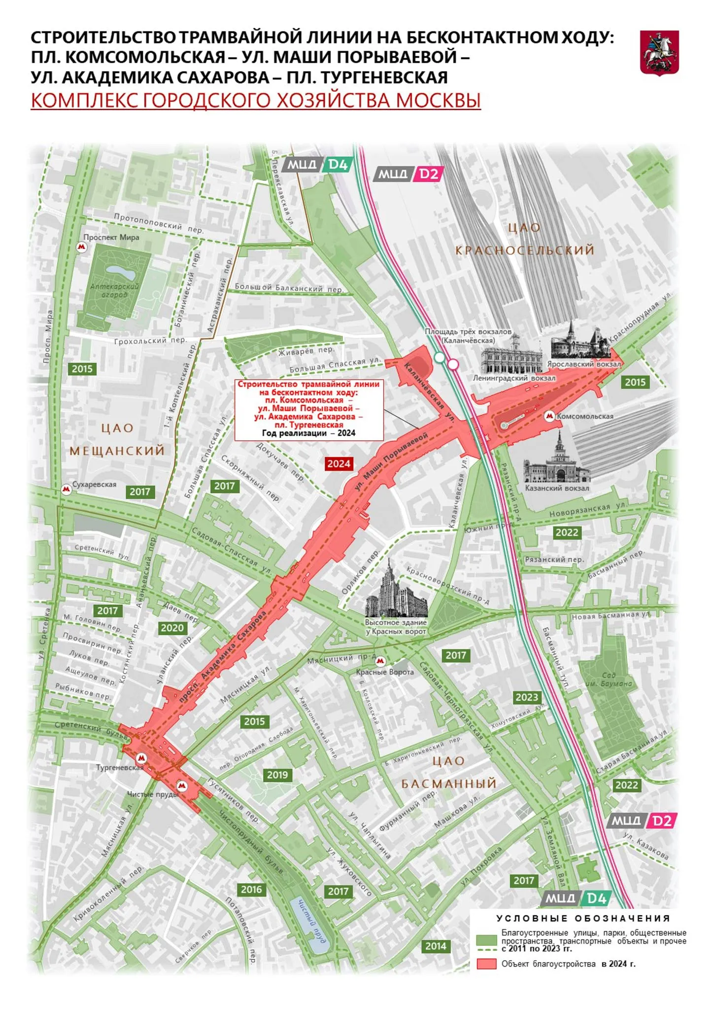 Вторая трамвайная линия длиной почти 2 км пройдет по улице Маши Порываевой и проспекту Академика Сахарова от Комсомольской площади к Чистым прудам.