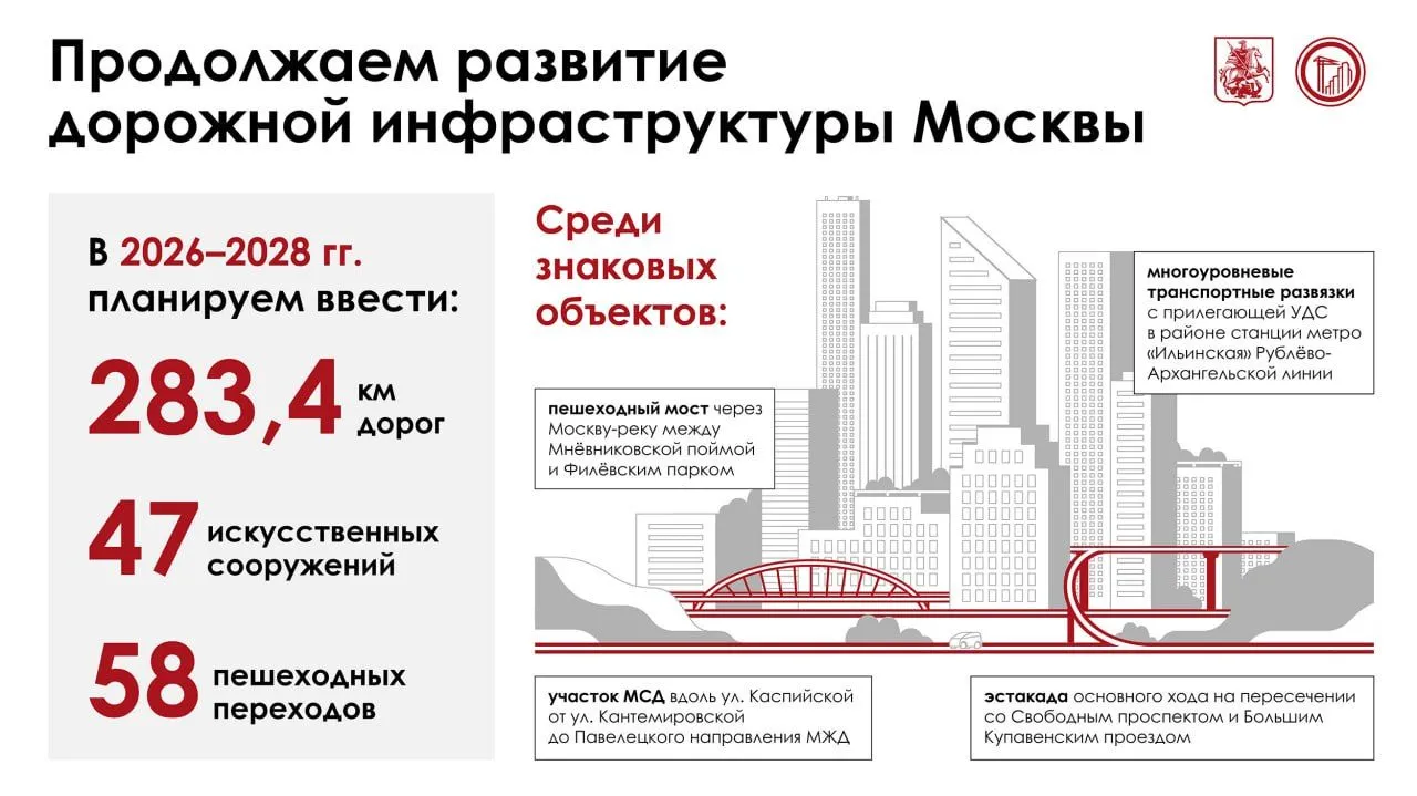 Ежегодный темп дорожного строительства — от 90 до 100 километров новых дорог — сохраняется в Москве с 2011 года. В ближайшие годы в городе реализуют несколько крупных проектов, среди которых мосты, эстакады и путепроводы в разных округах.
