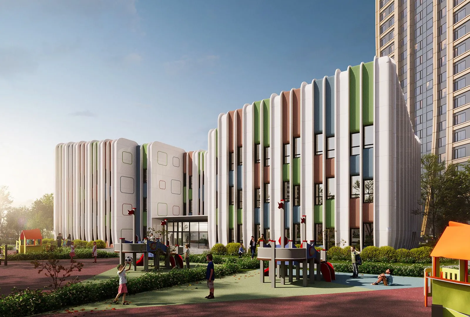 Здание выполнят по индивидуальному проекту. Его архитектурная форма будет напоминать стопки тетрадей. Фасады сделают яркими, с витражным остеклением.