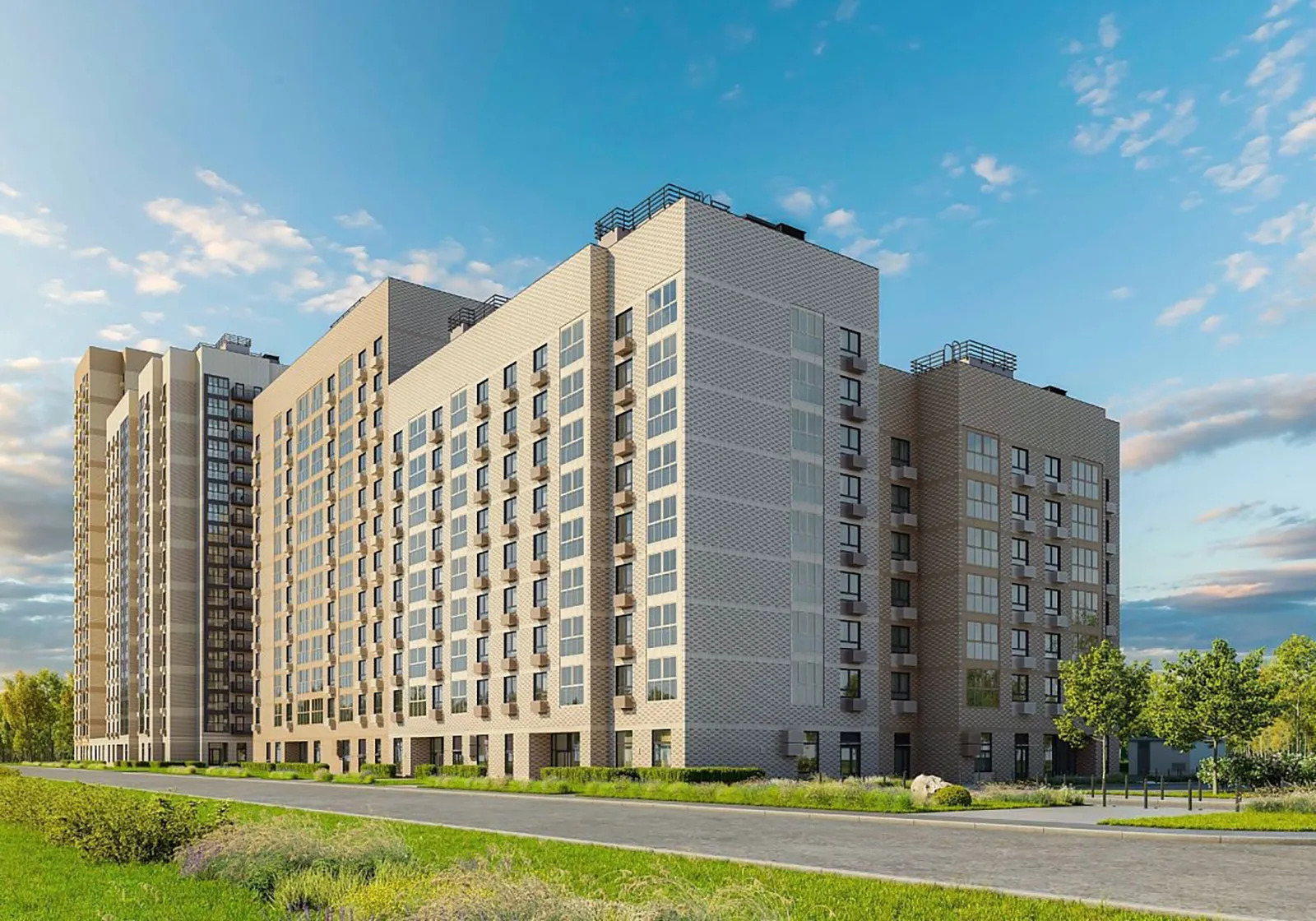 При отделке фасадов используют навесные трехслойные стеновые панели, облицованные керамическим кирпичом светлых оттенков. Установят металлические корзины под наружные блоки кондиционеров.