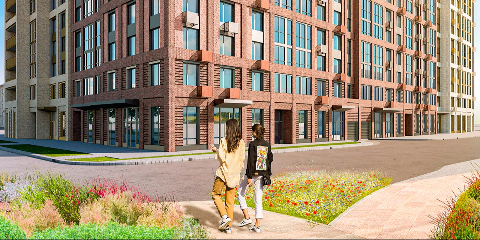 Дом переменной этажности построен в форме буквы П. Фасады отделаны рельефной плиткой с имитацией кирпичной кладки. Также установлены корзины для кондиционеров.