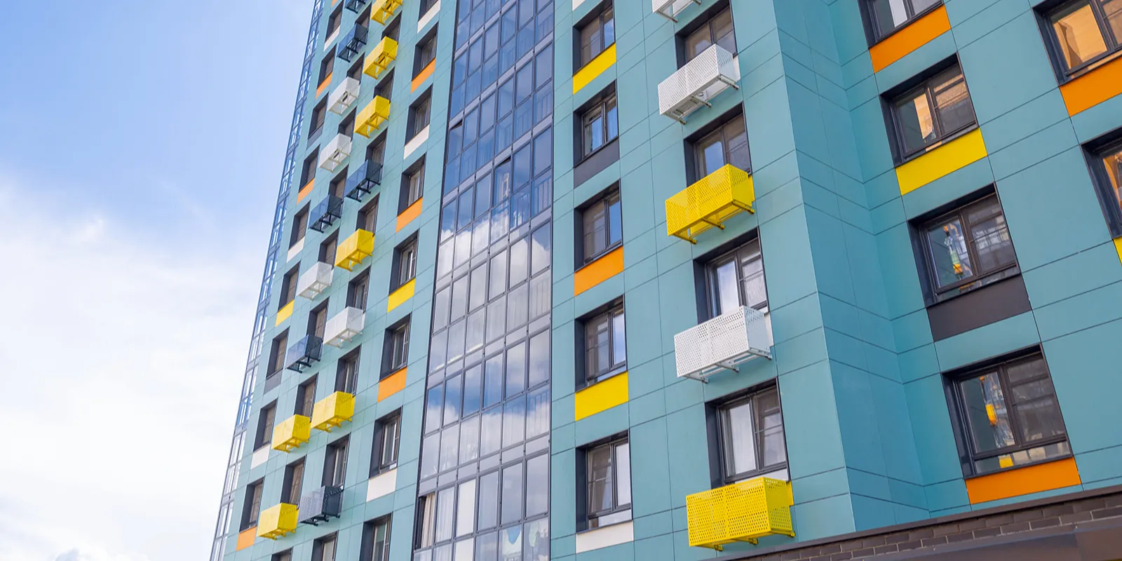 Фасады дома облицевали плитами из искусственного камня на основе мелкозернистого бетона красно-песочных оттенков. Входные группы оформили панорамными витражами. Балконы и лоджии квартир остеклили, установили корзины для кондиционеров.