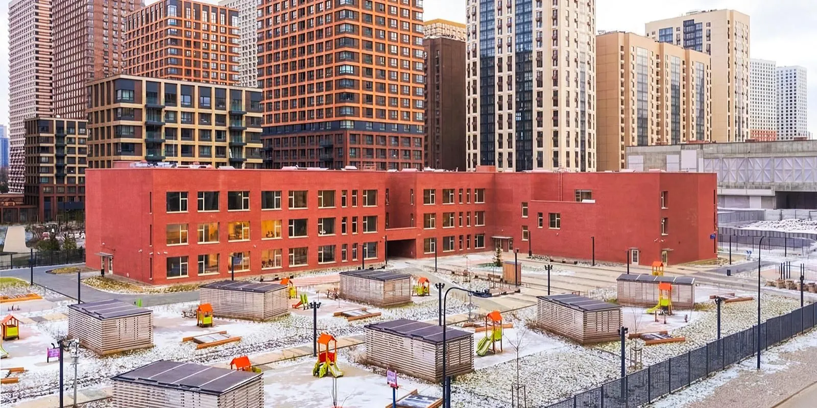 Рядом с жилым кварталом уже ввели в эксплуатацию детский сад с бассейном на 350 воспитанников. Территорию вокруг благоустроили: проложили проезды и тротуары, установили освещение и скамейки, оборудовали велопарковку, игровые зоны и площадки для мини футбола и гимнастики.