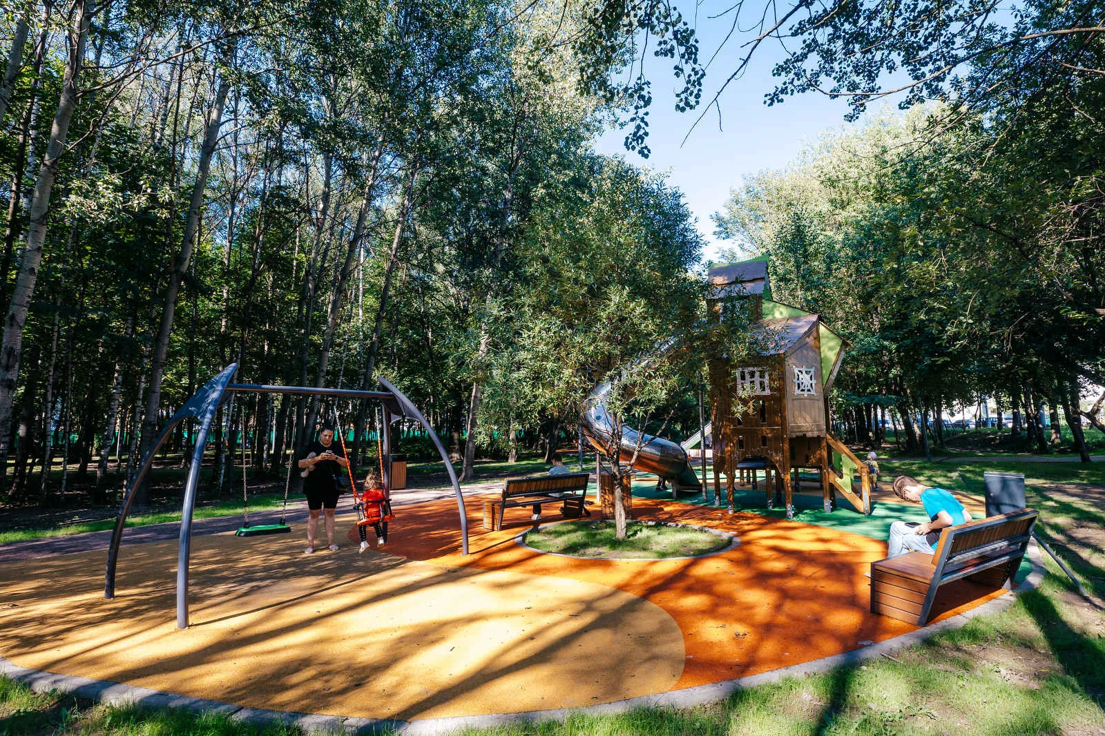 В сквере создали современное комфортное общественное пространство с пешеходными и велосипедными дорожками, спортивными площадками и местами для отдыха.Здесь отремонтировали тротуары и проложили новые пешеходные маршруты, вдоль которых установили лавочки. Обустроили игровые площадки для детей разных возрастов и спортивные зоны с тренажерами.