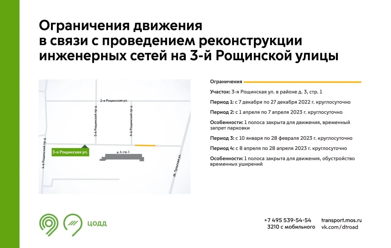 С 7 по 27 декабря 2022 года, с 10 января по 28 февраля и с 1 по 28 апреля 2023 года изменится схема движения на участке 3-й Рощинской улицы в районе дома 3, строения 1.