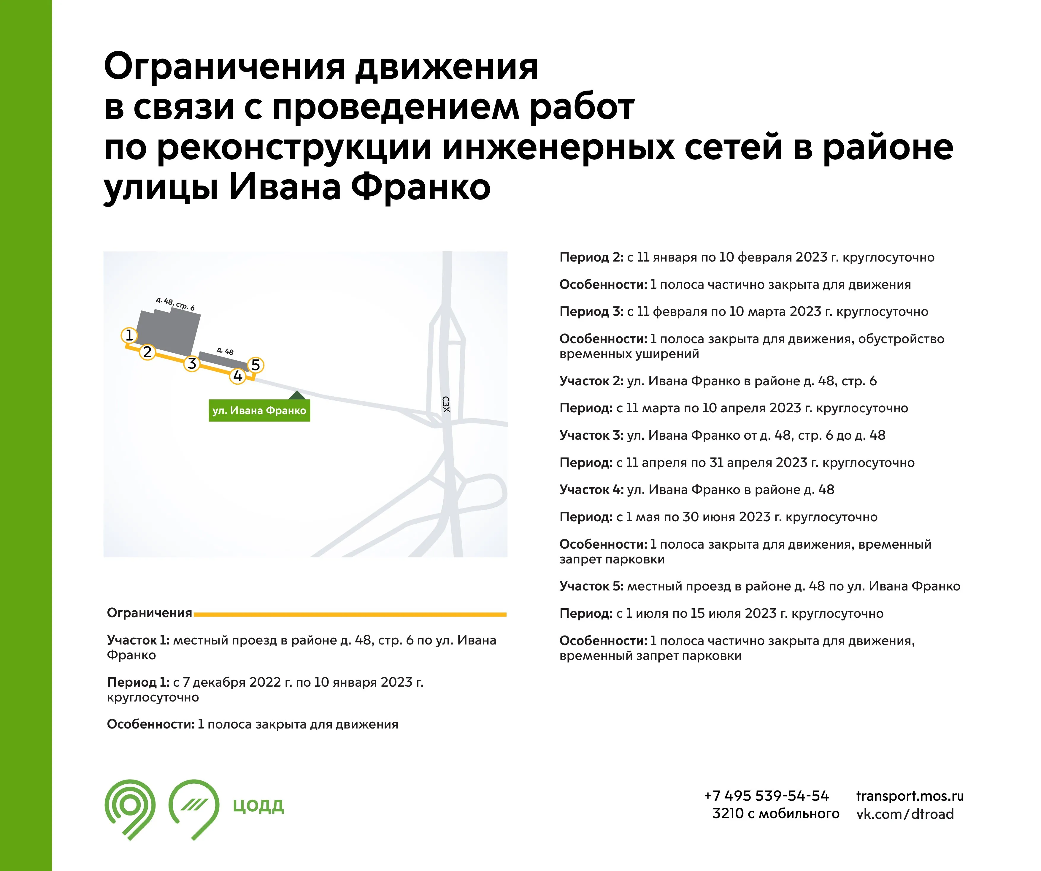 С 7 декабря 2022 года по 10 марта 2023-го и с 1 по 15 июля 2023 года будет недоступна для движения одна полоса на участке местного проезда в районе дома 48, строения 6 по улице Ивана Франко. Перекрытия на участках этой улицы будут действовать с 11 марта по 30 июня 2023 года.