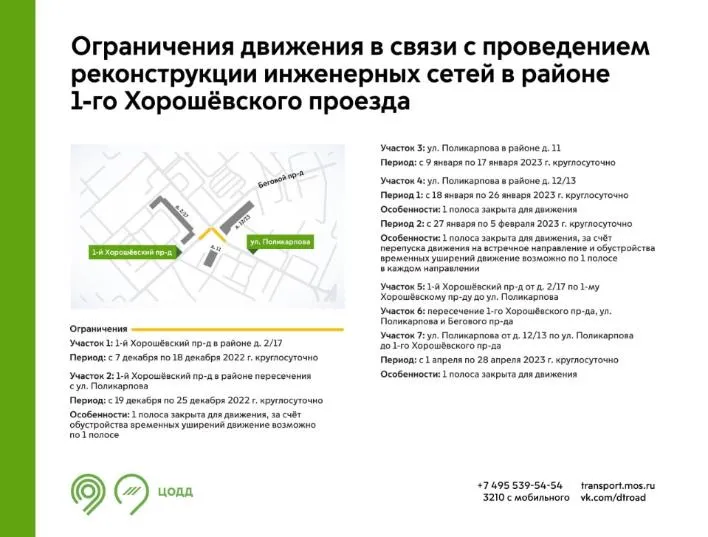 Из-за реконструкции инженерных сетей с 7 по 25 декабря 2022 года, а также с 9 по 17 января и с 1 по 28 апреля 2023 года будет перекрыта одна полоса движения на некоторых участках 1-го Хорошевского проезда.