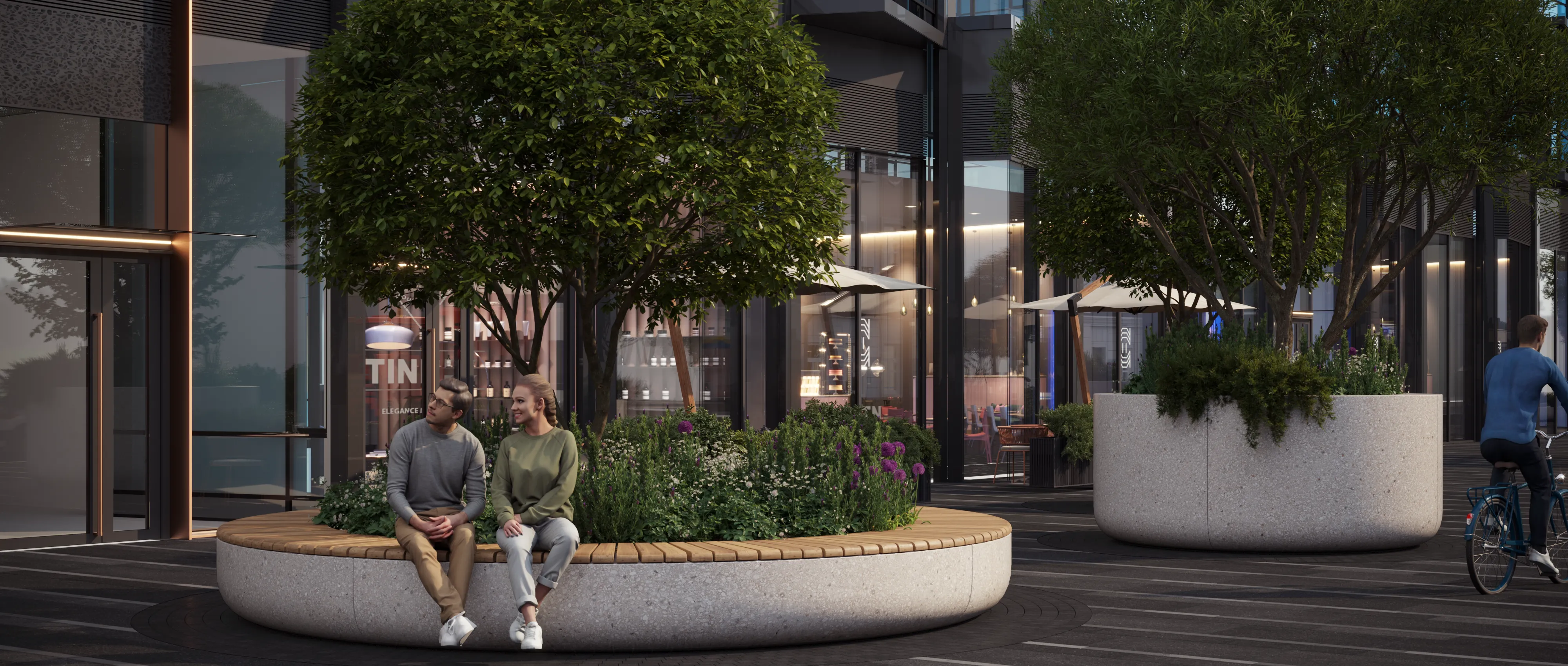 Компания PIONEER создаст новое общедоступное пешеходное пространство на Летниковской улице с несколькими десятками дизайнерских клумб-кадками из декоративного бетона с соснами-бонсай, злаковыми и кустарниками.