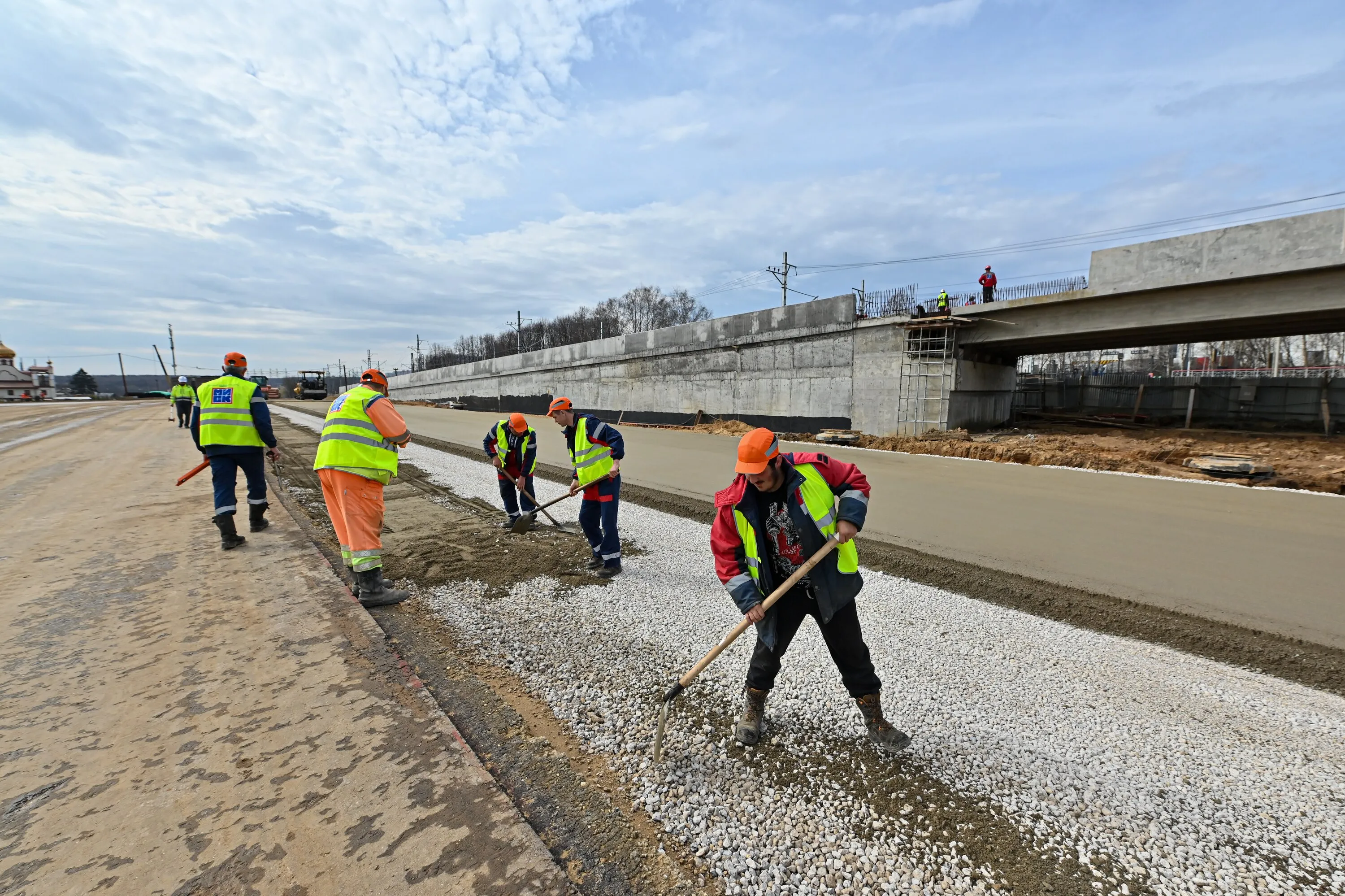 На 32-м километре МКАД завершается возведение тоннеля длиной 100 метров. Как уточнил руководитель строительства Алексей Кандеев, на начальной стадии работ были забурены трубы диаметром 1000 мм в количестве 72 штук, и только после этого приступили к разработке котлована. На сегодняшний день осталось уложить 500 кубометров бетона. Над тоннелем строится эстакада-съезд с МКАД на основной ход Московского скоростного диаметра. Возведение этого объекта тоже в завершающей стадии. Установку плиты-основания эстакады выполняли методом надвижки: на специальных стапелях собирали блоки, а уже потом с помощью подвесных конструкций соединяли.
