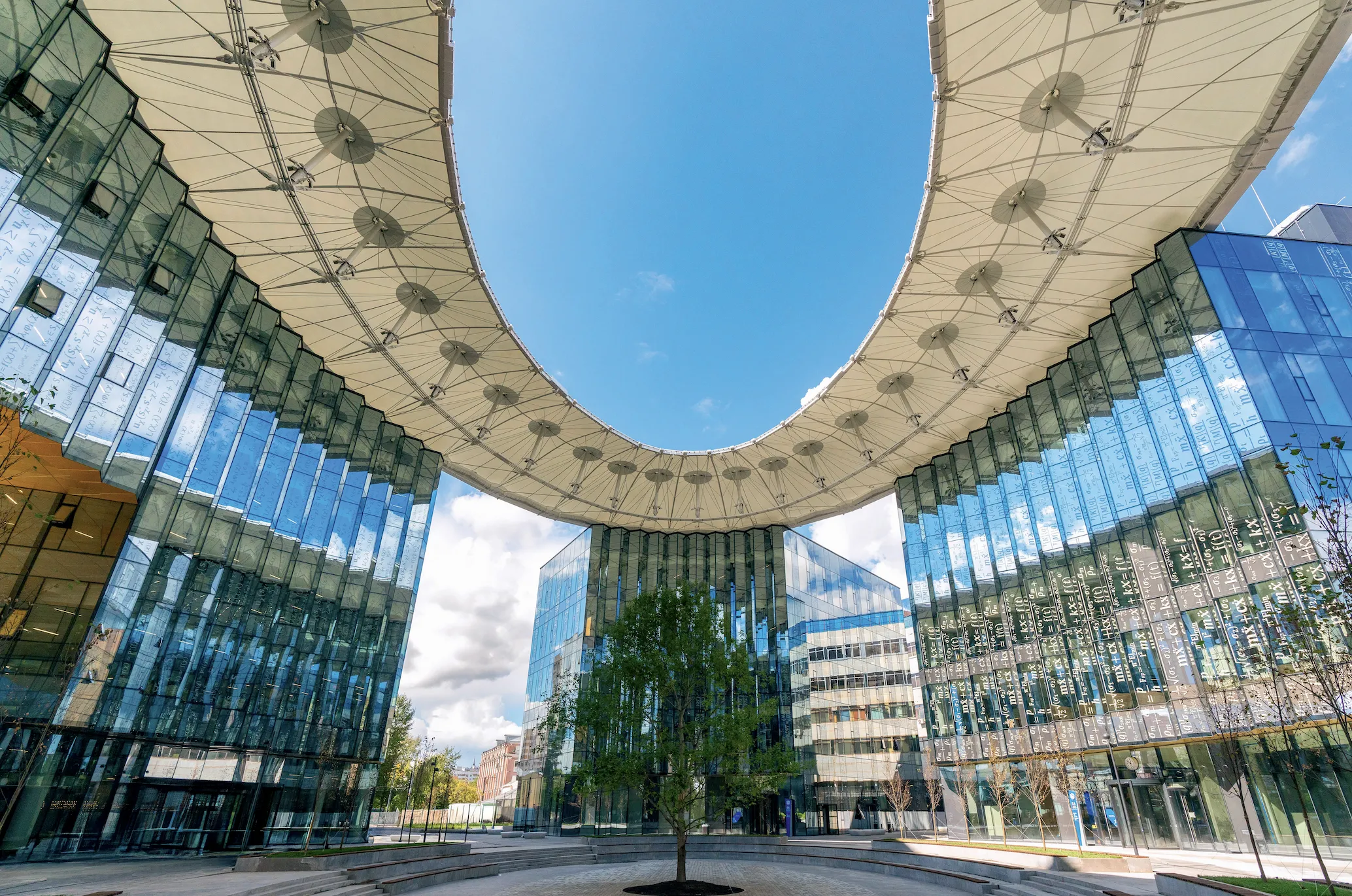Образовательный кампус для инженеров расположился по разным берегам Яузы – новые учебные корпуса и студенческий городок, больше похожий на деловой квартал и в шутку называемый «Сити на Яузе», соединяет пешеходный мост. Сердцем кампуса Бауманского университета стал центральный учебный кластер со стеклянным куполом. Центральная площадь, объединяющая корпуса учебного кластера, имеет мембранную крышу с овальным отверстием в центре. В центре комплекса высадили огромный дуб. Это дерево символизирует тягу к познанию, а также мощь и долголетие. Вокруг него амфитеатром выстроены многоярусные скамейки. Особенно эффектно ансамбль смотрится в солнечные дни, когда, отражаясь в зеркальных стенах, лучи света солнечными зайчиками играют на плитке. Новый кампус МГТУ имени Н.Э. Баумана стал первым объектом в стране, построенным по федеральному проекту «Создание сети современных кампусов» и реализуемым в рамках национального проекта «Наука и университеты».