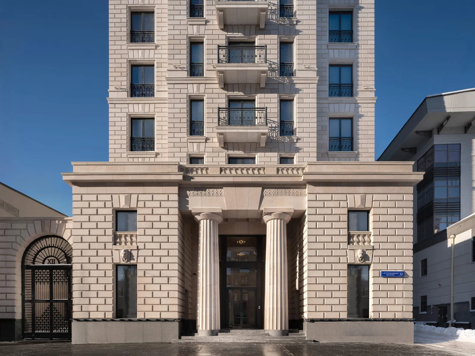 Жилая площадь комплекса превысила восемь тыс. кв. метров. Фасад облицован доломитом бежевого оттенка, снаружи установлены декоративные элементы и барельефные панно из металла.